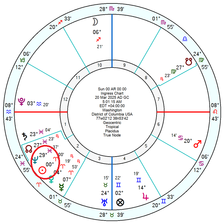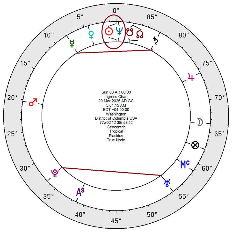 The 2025 Aries Ingress chart features transiting Neptune at 29°37′ in Pisces, forming an out-of-sign conjunction with the Sun at 00°00′ Aries.
